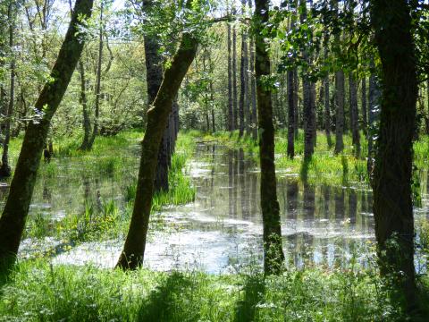 - Les forêts alluviales à Alnus glutinosa et Fraxinus excelsior : Boisement caractéristique de transition entre les forêts mixtes riveraines des grands fleuves et l’aulnaie marécageuse, il se situe généralement en bordure extérieure des bas marais. Les essences majoritaires sont l’aulne et le frêne, et la strate herbacée est caractérisée sur le site par la Laîche espacée et Laîche à épis pendants. Les habitats forestiers se différencient sur le site par leur stade d’hydromorphie. Ils représentent des milieux particulièrement favorables à la Loutre et au Vison d’Europe.